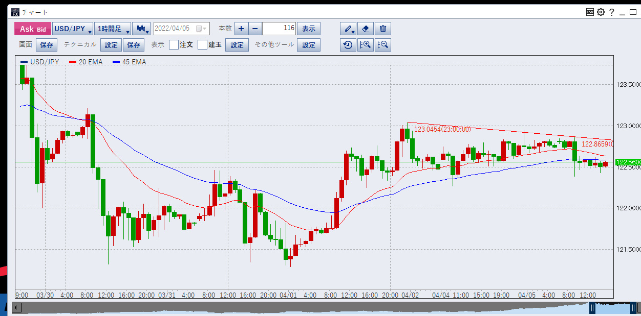 2022年4月5日FXドル円相場は122.7円付近から開始しました。短期足レンジとはいえ、安値を徐々に切り上げているため、どこかでぐんと伸びそうな気配を見せています。