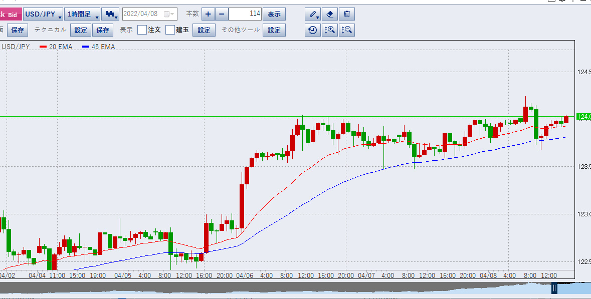 2022年4月8日FXドル円相場は朝7時から大きな上昇でスタートしました。がしかし、124ラインを越えて124.2を付けるとすぐに反落、一旦は123.7辺りまで下げました。