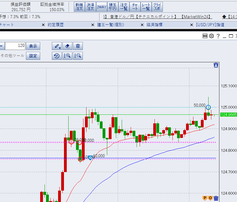 上記は5分足で、125円の攻防を示しています。125円で売りが出ると予想し売りを入れていますが、この後爆上げし含み損となる。