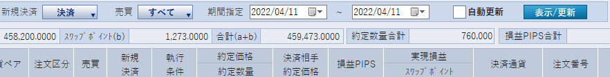 前日は結局高値125.7を抜けることはできず、結局125.45で決済することになりました。ラインは1時間足の安値です。結果は以下の通り45万円ほどの利益となりました。