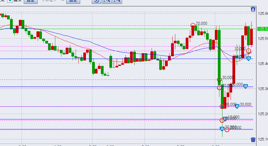 上の画像は午前中の状況です。日本時間開始からすぐに下げ、125.1付近まで下げたあと、すぐに反発しました。このように、下げたらできるだけ買っていきます。