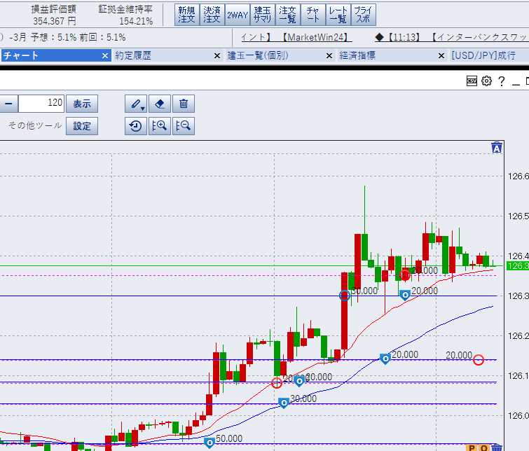 上記は11時時点の状況です。高値126.3を抜け、126.5を付けました。画像にもありますが、この時点での含み益は35万円程度。こうなると127円がいよいよ現実味を帯びてきました。