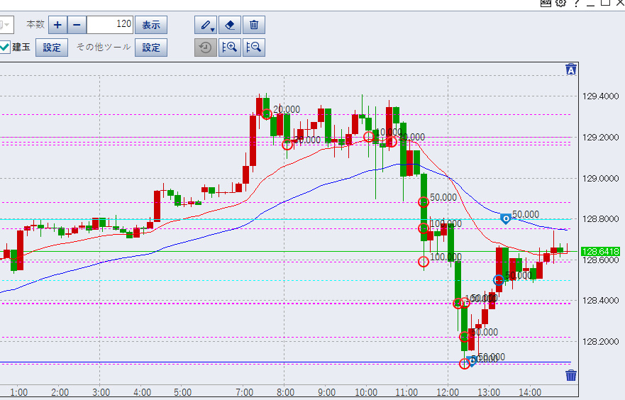 ご覧のように本日は11時頃から一気に下げ、一時128.1を付け、決済ラインを割りました。決済金額は45万円程度となりましたが、底では含み損-20万円程度となり、少し慌てます。