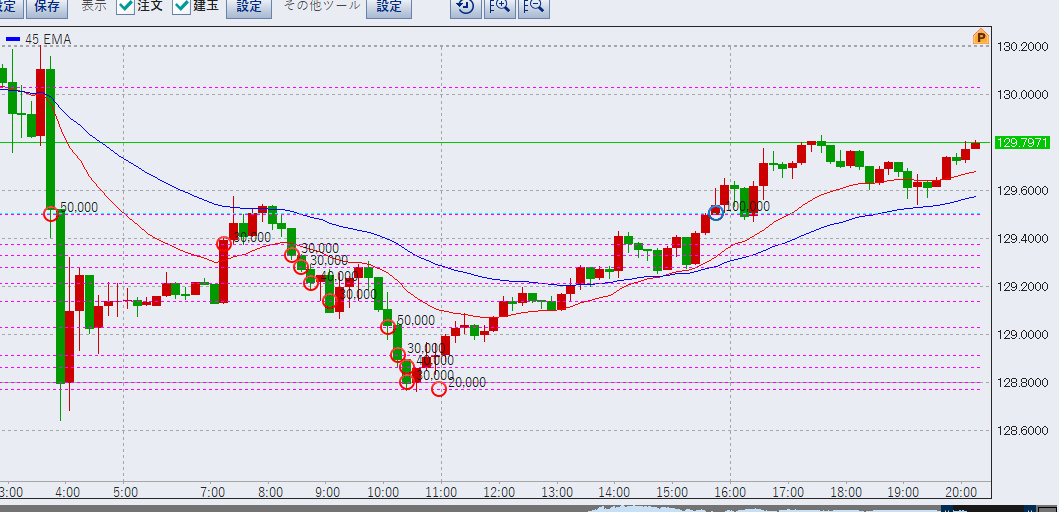 上記は20時時点の10分足です。ご覧のように一度底を叩いてから再び上昇し、129.8を付けました。この時点での含み益6万円ですが、本日は損切り分-20万円程度出ており、巻き返したいところであります。