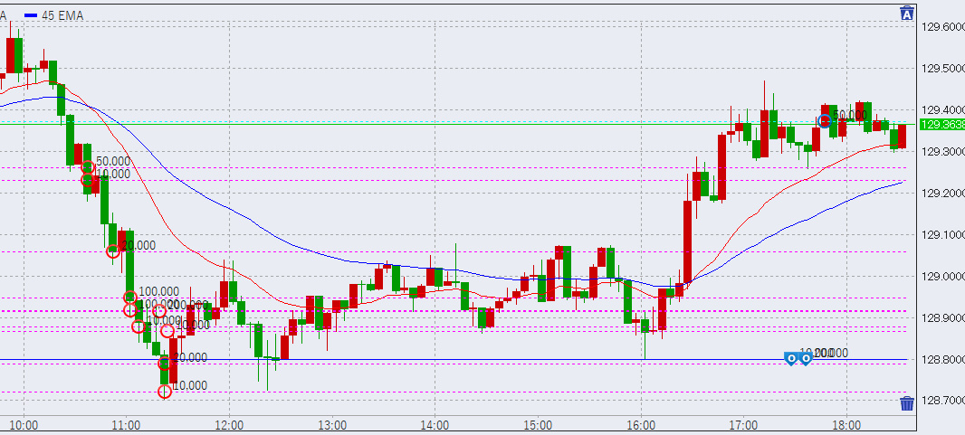 以下の画像は18時次点の1時間足です。本日は日本時間入り後128.7付近まで一気に下げ、その後国債金利上昇とともに夕方時点で129.4まで回復しました。