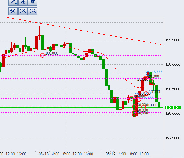 前日はアメリカ時間においてさらに下落、安値128.01を付けました。米株安、景気後退などの懸念から上値が重い状態が続いています。