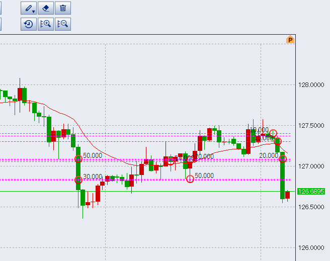 なお今日は126.5ラインを底と睨み、できる限り利益を稼ぐために決済ラインをあえて入れなかったのですが、案の定底付近まで下落するという馬鹿を見ました(苦笑)。