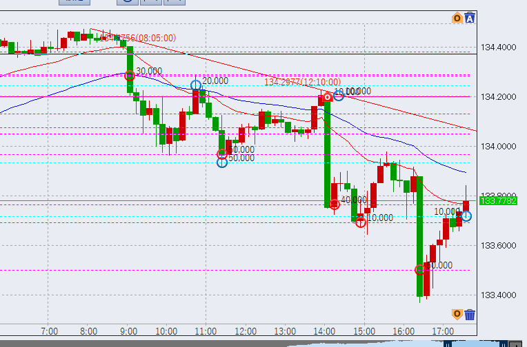 前日ドル円は133.2付近まで下落しましたが、その後アメリカ時間で1円近く上昇し朝時点で134.4を付けています。