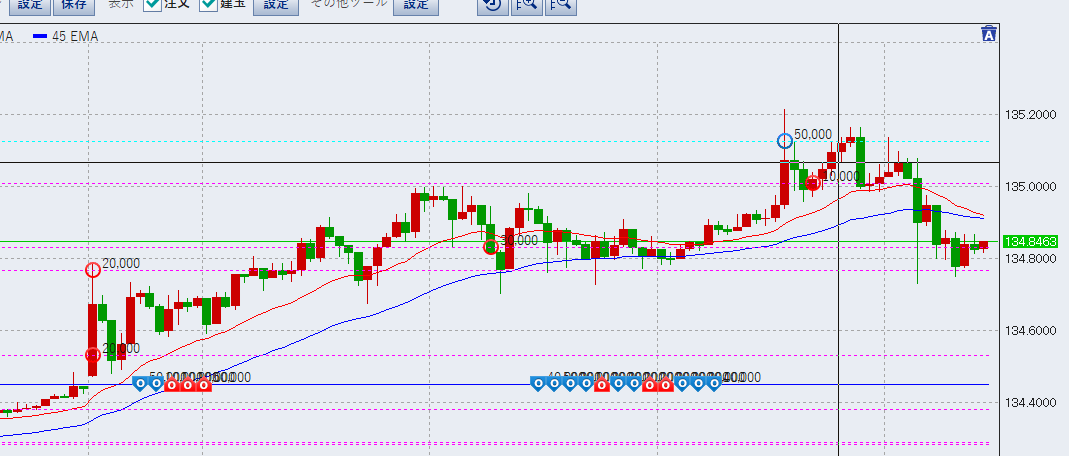 画像は15時時点での10分足です。ご覧のように135を上抜けましたが、一度目のトライでは売りが約定しなかったため、二度目のトライ時に5万の売りを入れました。