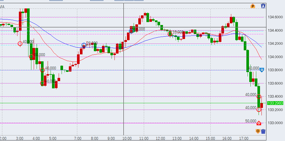 画像は18時時点での10分足です。16時から一気に1円程度下落し、この時点で133.2を付けました。決済ラインを高値に設定しておけばよかったと後悔しても遅いので、高値で適宜売りを入れて凌ぎたいと思います。
