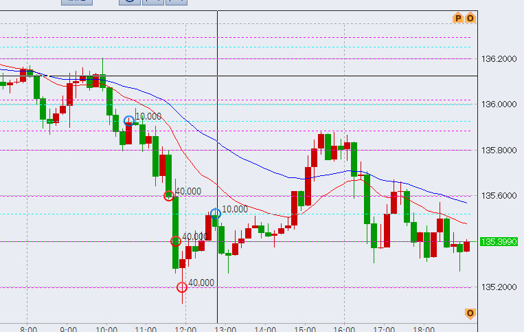 画像は本日朝からの値動きです。ご覧のように下げ、135.2ラインでこらえているという状況ですが、もう一段落ちそうな気配が漂っています。