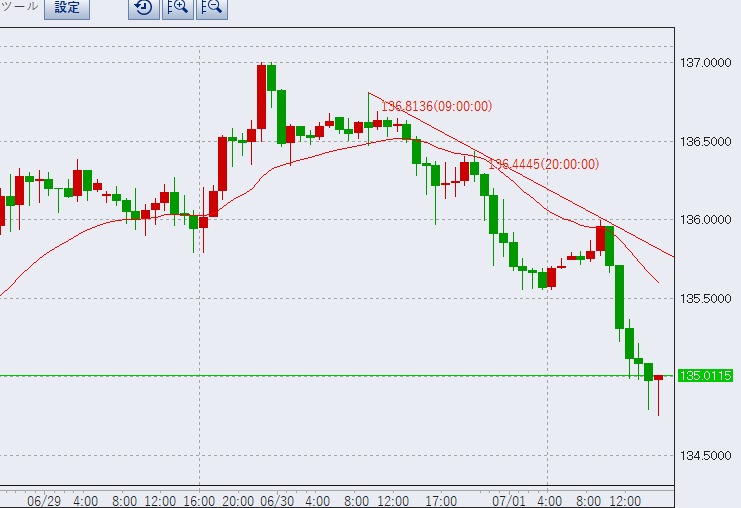 前日からドル円は緩やかに下落し、135.6付近で底を打った後やや上昇し、朝時点で135.8を付けています。