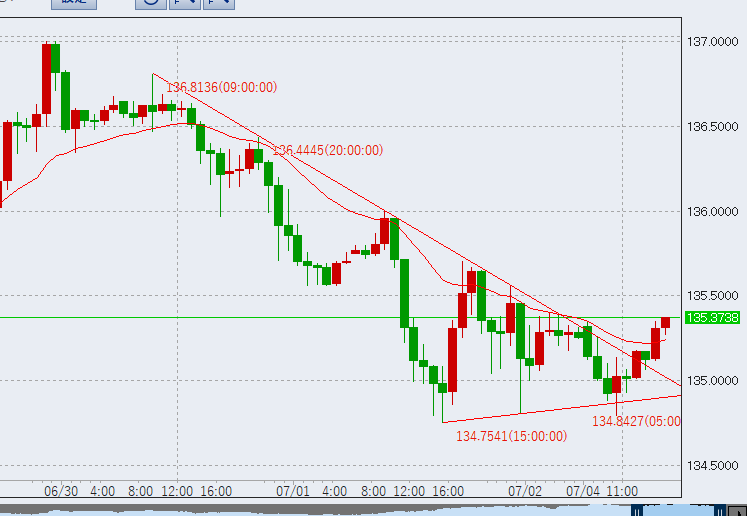 上下にトレンドラインを引きましたが、ご覧のように高値のラインを抜け、上昇の流れが出始めました。相場は15時時点で135.35を付け、下落からレンジ相場となっています。