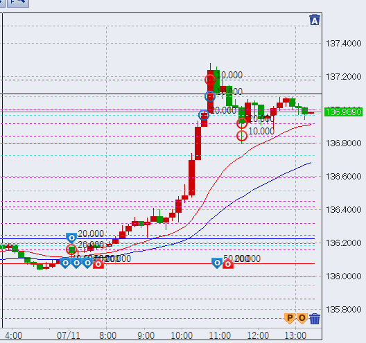 その後少しずつ下げ、16時過ぎに136.8を付けましたが、ここからのもう一段上昇に期待です。決済ラインはこの後新しく形成される4時間足の安値に入れることにします。
