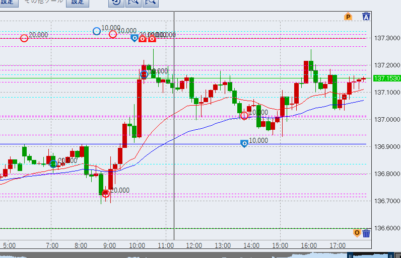 本日は朝から上昇に転じ、18時時点で137.2を付けています。この時点での含み益は+5万円程度。このくらいの上昇ではまだ決済ラインは敷けませんが、停滞するようであれば低めに決済ラインを敷き、利益チャンスを逃さないようにします。