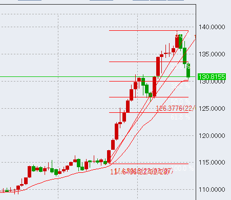 ドル円の押し目はなかなか反発せず、ジリジリと下げてきており、朝時点で6月安値である131.4を付けました。米国債10年の利回りは2.56まで低下し、相場の重しとなっています。
