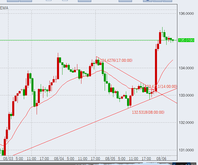 ドル円は前週夜、雇用統計の堅調ぶりを受けて大幅に上昇、一時135.5まで戻しました。以下は1時間足の様子ですが、トレンドラインに沿って綺麗に上げており、上昇トレンドを継続しています。