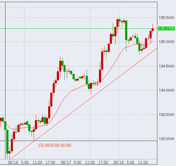 前日ドル円は上値を伸ばし135.5を付けました。その後夜中に134.8まで下落した後は反発し、朝時点で135.1付近となっています。