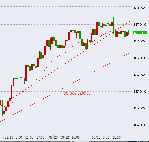 画像は本日の日足・15時頃のものです。新旧2本のトレンドラインを引きましたが、どちらもラインを外れており、気迷いがあることを示しています。とはいえ、値は底堅く推移しており、19時過ぎには再び137.5を付けています。