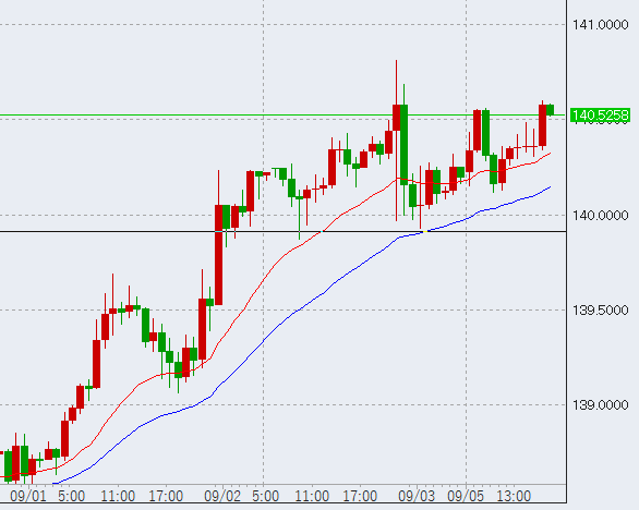 本日は日本時間入り後下落し、下降の流れになるかと思いきや、10時過ぎからは安値を切り上げる値動きとなり、17時頃には本日の高値を抜いて140.6を付ける底堅い展開となっています。