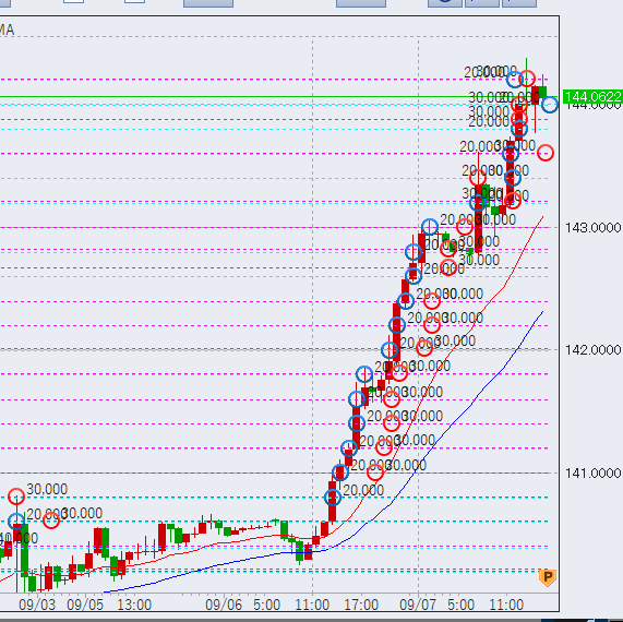 本日もドル円は上昇を続け、13時過ぎには144.38を付けました。含み益は一時880万円程度まで膨らみましたが、そろそろ大きめ下落(調整)が来そうな水準です。
