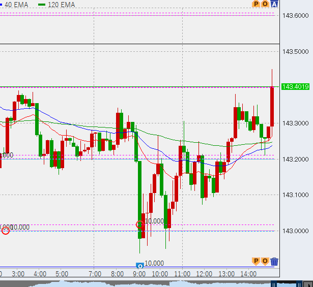 低調かなと思っていた矢先、17時過ぎには前日高値である143.65を越え、143.75を付けました。これにより、テクニカル的には1時間足が上昇相場となり、これが続けば4時間足も上昇相場となるでしょう。