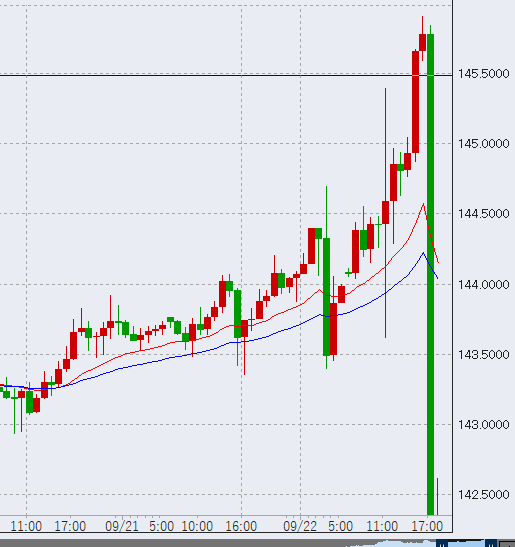 ところがその後、ドル円は急激に下落。すぐに日銀が為替介入を行ったとの報道があり、ドル円は一気に5円程度下落し、一時141円を付けました。