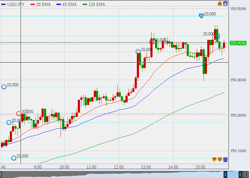 日銀の介入を恐れていた市場ですが、現状では2発目は確認できておらず、未だ警戒感は続いています。本日15時過ぎには150.4を付け、未だに上昇が続いています。