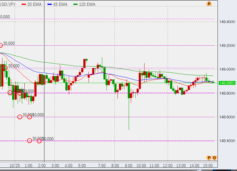 前日ドル円は朝から介入らしきものが入り急落しましたが、その後すぐに反発し149円を回復しました。本日朝時点では少し下げ148.8付近となっており、含み益は+120万円程度出ています。