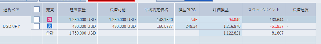 下の画像は現在の建玉です。買いが126万ドル、売りが49万ドルです。買いは現在マイナスですが、売りは+120万円ほど出ています。ただこの売りは上昇相場である以上ヘッジですので、決済ライン以外では決済しません。