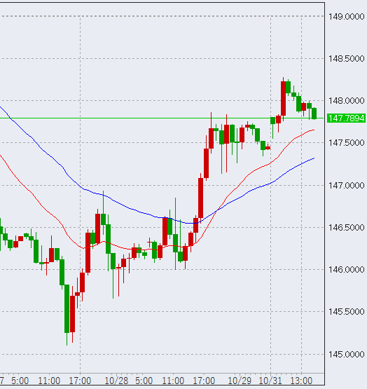 本日は午前中まで堅調に伸びていたものの、昼過ぎからダレてきました。この後のヨーロッパ時間で見通し高値である148.4に到達できるでしょうか。