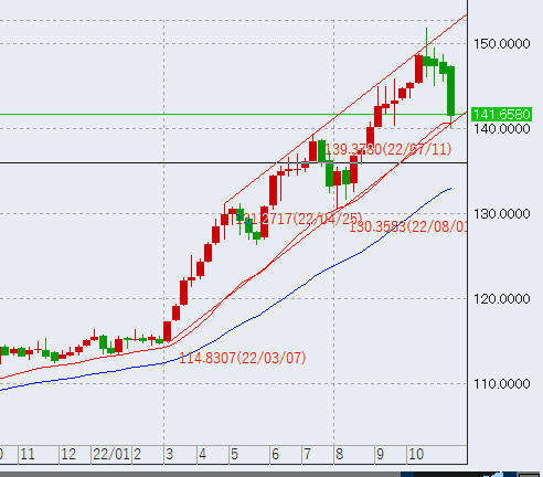 前日ドル円はCPIの鈍化を受け急激に下落。米選挙の動向もネガティブな影響を与えたのでしょうか、146円代から一気に140円代まで下げました。
