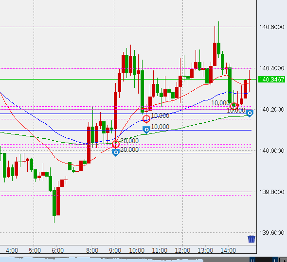 前日ドル円は小幅ながら反発、日足は陽線となりましたが、140.8付近まで上昇後は下げの流れとなり、本日朝時点で139.9付近となっています。