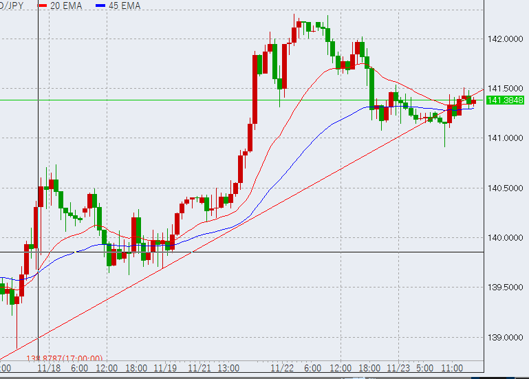 前日のドル円は高値を前に下落し、結局夜中も米国債利回り低下に押される形でジリジリと低下、本日朝時点で141.2付近となっています。しかし、141.2付近では土台が形成されつつあり、金利低下のわりには底堅さを示しています。