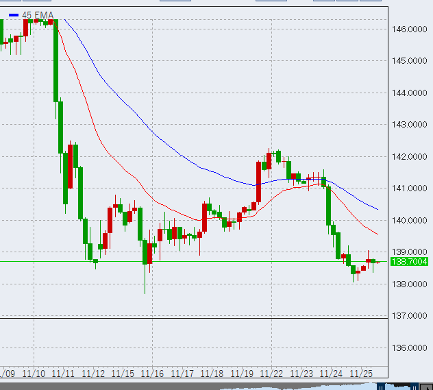 以下4時間足は相当ダレました。しかし現在のところ安値(137.7)は下回っていません。138円がサポートラインとなるかどうかというところです。