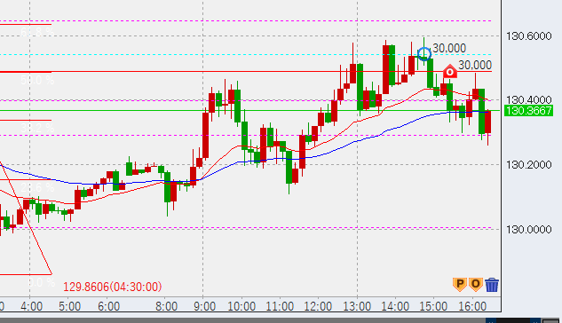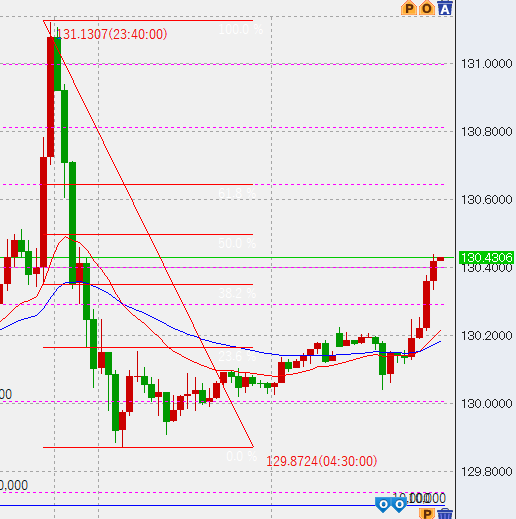 本日の見通しですが、反発上昇してくるようなら高値売りを入れようと思います。売りの水準ですが、以下のように前日の下落幅に対してフィボナッチを引き、その最も高い水準である130.6付近まで到達すれば4~6万程度を入れる予定です。
