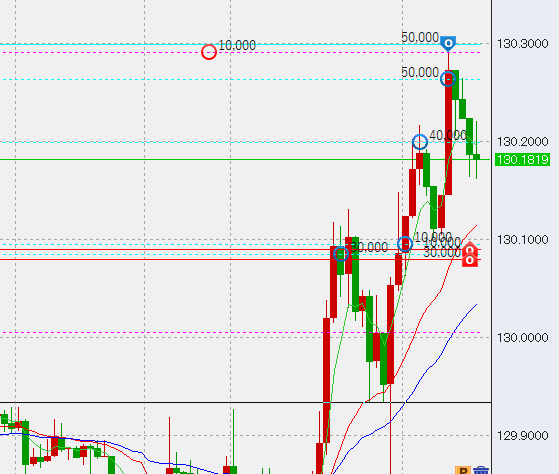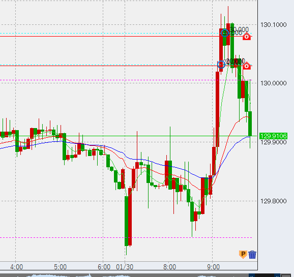 その後130.3付近まできたためさらに5万売り増し。なおはじめの2万はトントン決済しました。この後第一水準についてはトントン決済、残る上二つは高値決済の予定ですが、さらに上昇する場合第一水準は損切りします。