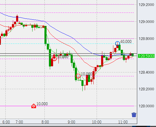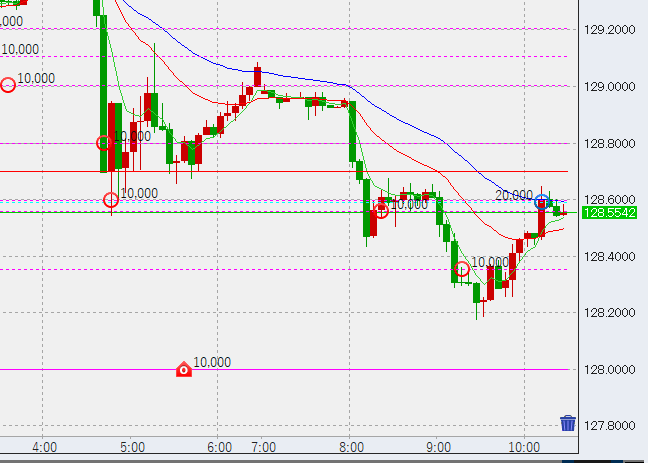 10時過ぎ2万売り投下。売りの決済ラインは現状128.70です。