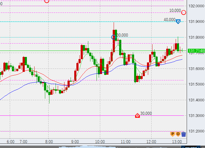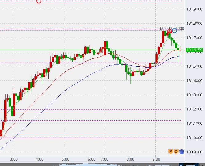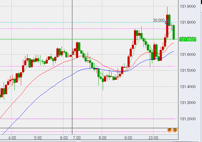 10時高値更新。これにより4時間足上昇幅が引き延ばされ、50%ラインは131.13付近となりました。このため、131.1-131.3付近まで下落すれば買いを入れようと思っています。また引き続き上昇継続し、132円以上まで上昇する可能性も視野に入れますが、その場合は短期売りとします。