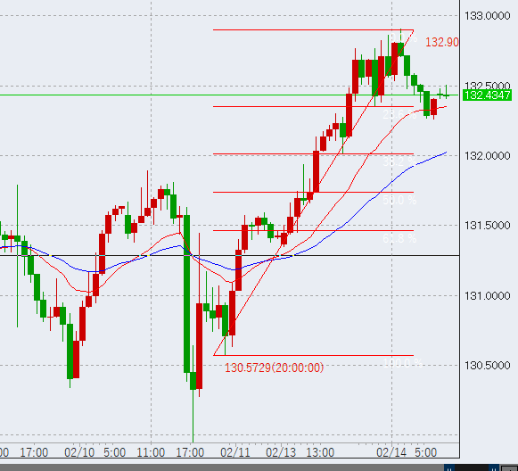 画像は4時間足の上昇幅にフィボナッチを引いたものです。前日高値から少し下げましたがまだ20%ちょっと。このため本日はもう少し下げる可能性が高いでしょう。有力な買い場としては、38.2%ラインである132円周辺となりますが、本日は繰り上げ法を用いるため上でもどんどん買っていきます。