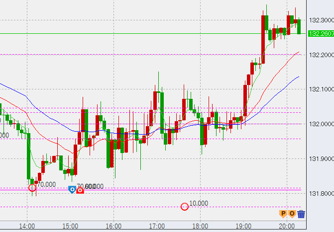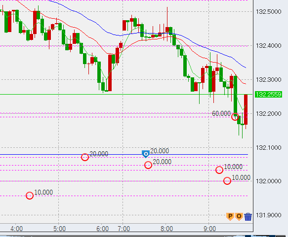 20時過ぎ132.3。この次点で高値に6万売り、底に7万買いを入れており、CPI直前にこの高値・安値双方にトントン決済を入れることでどちらかが決済し、どちらかの利益が大きく取れるというわけです。また、どうしてこのように繰り上げ法を用いるのかと言うと、それは底で買うためです。このように底で買うことによって、トントンでも安値にストップを入れたこととほぼ同じとなるため、後が非常にやりやすいのです。
