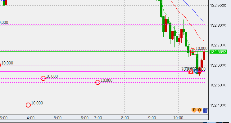 10時さらに6万追加。上部三つの買いの決済ラインは132.8に設定。