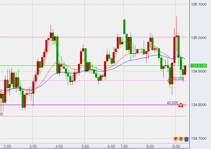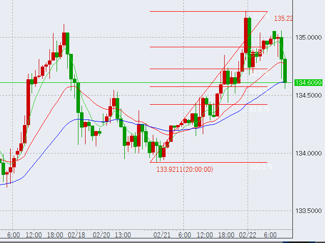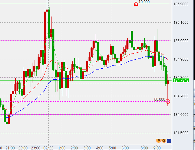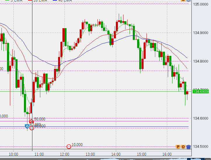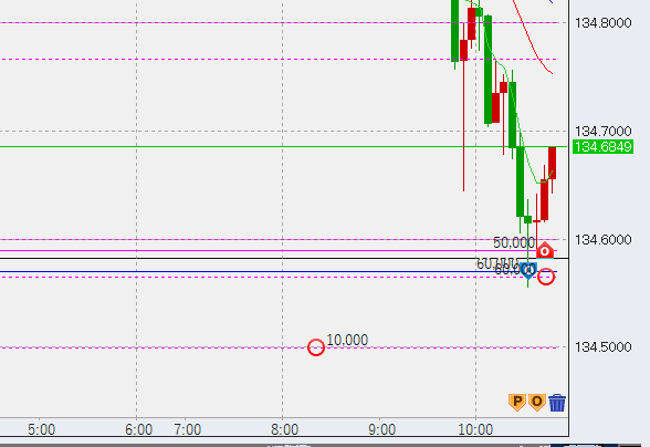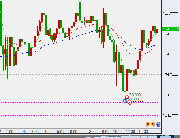 10時半。ドル円はさらに下げ、前日上昇幅の50%ラインをタッチ。ここから上昇の兆し。底(134.56)に6万買い入れしました。