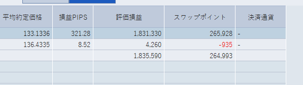 なお現在は日米間の金利差が大きいため、以下のようにスワップポイントも26万円ほど付いており、これがドル円を長期買いする理由の一つです。なお長期買いは週足決済とするため、半年~長くて一年ほど保持することになります。