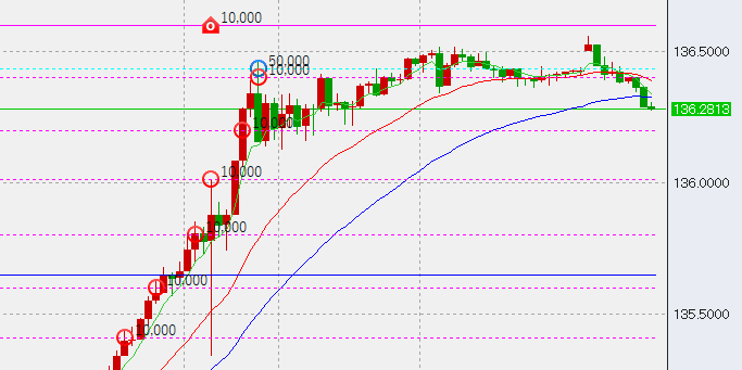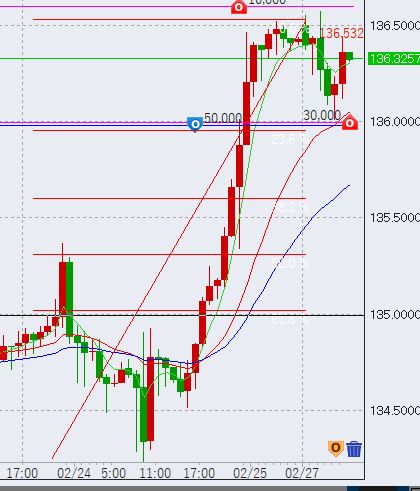 15時過ぎやや上値重い。値は5万売りのラインに掛かっていますが、下げそうな雰囲気なのでもち続けています。そして5万売りは、もし136円の決済ラインに掛かるようならトントンよりやや下に決済ラインを敷き、ヘッジとする予定です。