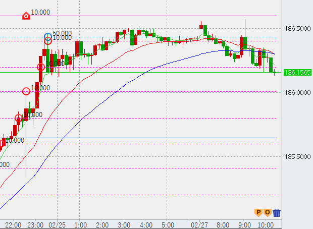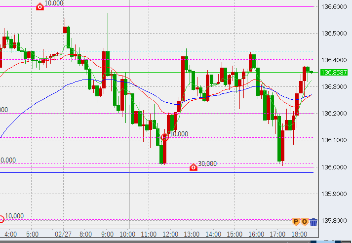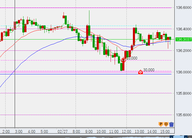 10時過ぎ136.2付近。まだ下がりそうです。短期買いの決済ラインは1時間足安値ですのでまだ設定していません。