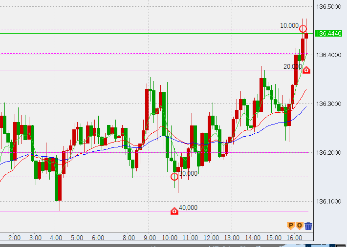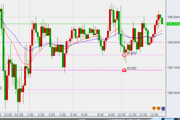9時ドル強い。上の3万無事決済。また、5万売りも136.3付近で決済しました(微益)。次回の売りは137円に設定です。