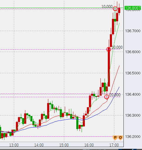 その後強い伸び。2万買い増し間に合いましたが、もう少し買っておけばよかったです。また、どこかで少し大きめの高値売りを入れたいですが、137円では低い感じがするので、やはり今日は見送りとなりそう。
