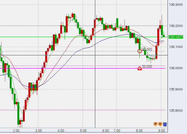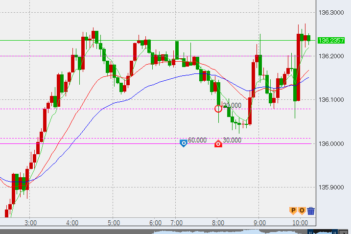 10時過ぎ、1時間足安値が136円上で決まったため6万の決済ラインをここへ移動。さあどこまで伸びるか?または折れるか?
