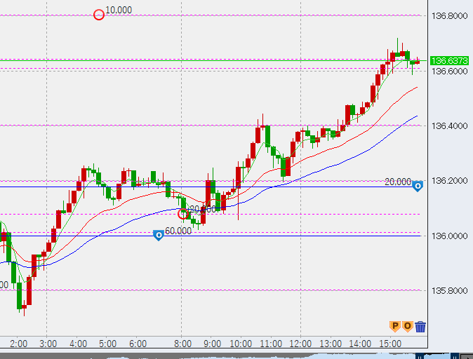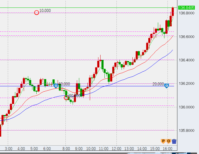 16時前上昇維持。前々日高値(136.92)に迫っています。
